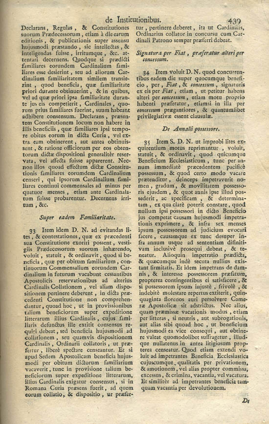 35 Ítem, nuestro Santísimo Señor para que se repriman malos litigios de quienes intentan maniobras, decidió, estableció y ordenó que cualquiera que hubiere impetrado un beneficio eclesiástico, después de que ya se hubiere poseído pacíficamente por el año inmediatamente precedente, y el cual se pretende de modo cierto que está vacante, está obligado a expresar el título, el grado y la movilidad del poseedor del mismo, y por cuántos años el mismo lo hubiere poseído, y una específica y determinada causa de esta impetración, de la cual claramente pueda constar que no compete ningún derecho al mismo poseedor
