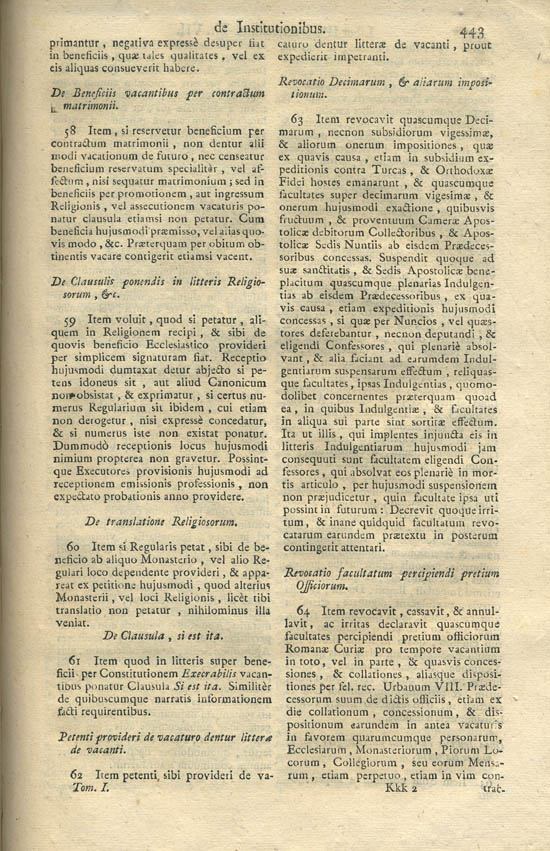 64 Ítem, revocó, cesó y anuló, y declaró írritas cualesquiera facultades de percibir un precio de los oficios de la Curia Romana entonces vacantes, en todo o en parte, y cualesquiera concesiones