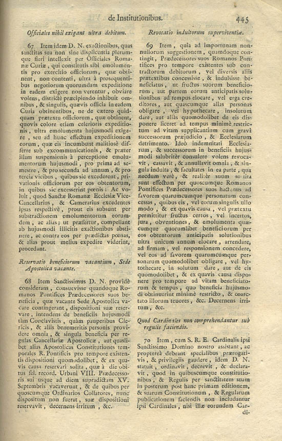 67 Ítem, el mismo Señor nuestro, decidiendo obviar las exacciones que Su Santidad, no sin desagrado, ha entendido que hacen generalmente los oficiales de la Curia Romana, que, no contentos con los emolumentos que ganan, y les son asignados por el ejercicio de sus cargos, no vacilan en exigir más de lo debido en la expedición