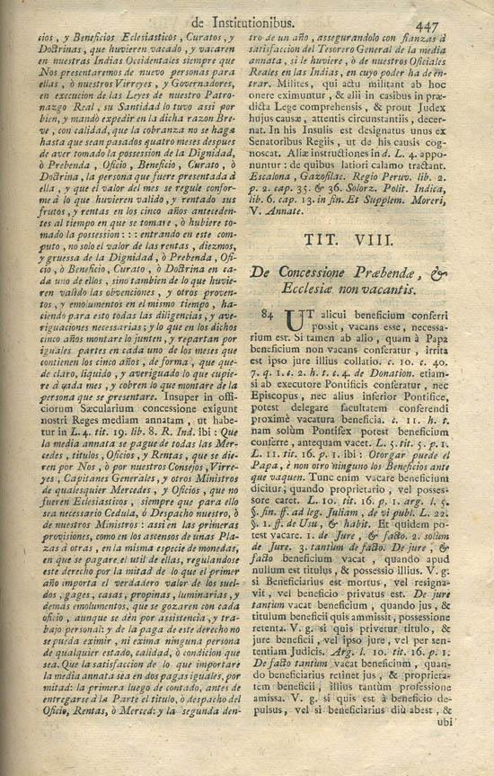 Curatos y Doctrinas, que huvieren vacado, y vacaren en nuestras Indias Occidentales, siempre que Nos presentáremos de nuevo personas para ellas, o nuestros Virreyes y Governadores, en execucion de las Leyes de nuestro Patronazgo Real, Su Santidad lo tuvo assí por bien, y mandó expedir en la dicha razón Breve, con calidad que la cobranza no se haga hasta que sean pasados quatro meses después de aver tomado la possessión de la Dignidad, o Prebenda, Oficio, Beneficio, Curato, o Doctrina, la persona que fuere presentada a ella, y que el valor del mes se regule conforme a lo que huvieren valido, y rentado sus frutos y rentas en los cinco años antecedentes al tiempo en que se tomare, o hubiere tomado la possession;