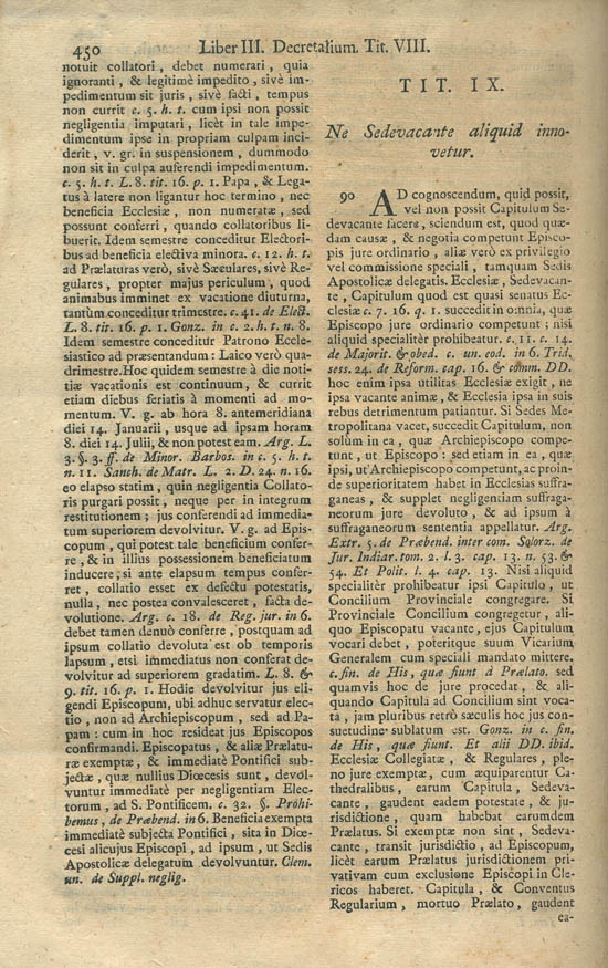algo especialmente. c. 11. c. 14. de Majorit et obed. c. un eod. in 6. Trid. sess. 24. de Reform. cap. 16. et com. DD. Esto lo exige la misma utilidad de la iglesia para que, estando vacante, no vayan a sufrir detrimento las almas y ella misma en sus bienes. Si está vacante la sede metropolitana el cabildo sucede al arzobispo no sólo en aquellas cosas que le competen como a obispo sino también en aquellas que le competen como a arzobispo. Por lo tanto tiene superioridad sobre las iglesias sufragáneas, suple las negligencias de las sufragáneas por el derecho de devolución y se apela a él de la sentencia de las sufragáneas. Arg. Extr. 5. de Praebend. inter com. Solorzano de Jur. Indiar. tom. 2. l. 3. cap. 13. n. 53. & 54. Et Polit. l.4. cap. 13. A no ser que se le prohiba algo al cabildo, como congregar el concilio provincial. Si el concilio provincial se congregase en algún episcopado vacante, su cabildo debe ser llamado y podría enviar a su vicario general con mandato especial, c. fin. de His quae fiunt a Praelato, pero aunque esto proceda del derecho y algunas veces los cabildos sean llamados al concilio, ya muchos siglos atrás este derecho fue suprimido por la costumbre. González in c. fin. de His quae fiunt. y otros autores ahí mismo. Las iglesias colegiatas o regulares, exentas por pleno derecho, como se equiparan a las catedrales, sus cabildos, sede vacante,