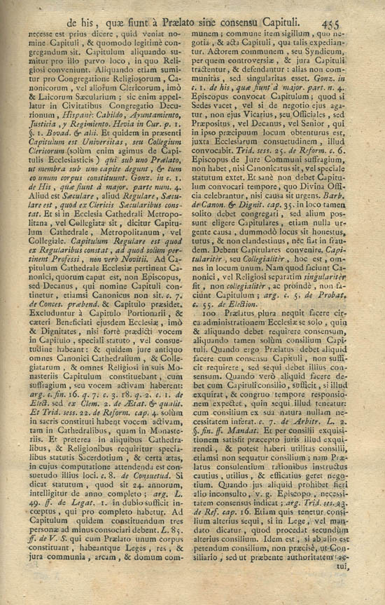 Pero los capitulares pueden elegir otro lugar, aunque no haya ninguna causa urgente, con tal que sea honesto, seguro y no clandestino, ni se haga por fraude. Los capitulares deben estar en acuerdo capitular o colegialmente, esto es, reunidos todos en un solo lugar. Porque lo que hacen los canónigos o religiosos separadamente, se hace de modo singular, no colegial, y por lo tanto no hacen cabildo. arg. c. 5. de Probat. c. 55. de Election.