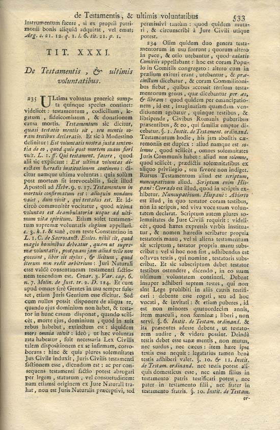 234. Estuvieron antes en uso dos géneros de testamentos. De los cuales uno se usaba en paz y tranquilidad y se le llamaba colatis comitiis (convocados los comicios), éste se hacía frente al pueblo llamado a junta. Otro se usaba cuando iban a salir a combatir y se llamaba praecinctum (rodeado) y se hacía frente a los compañeros de la milicia, a los cuales se añadió una tercera clase de testamentos que se denominaba per aes et libram (por moneda y balanza), el cual se hacía