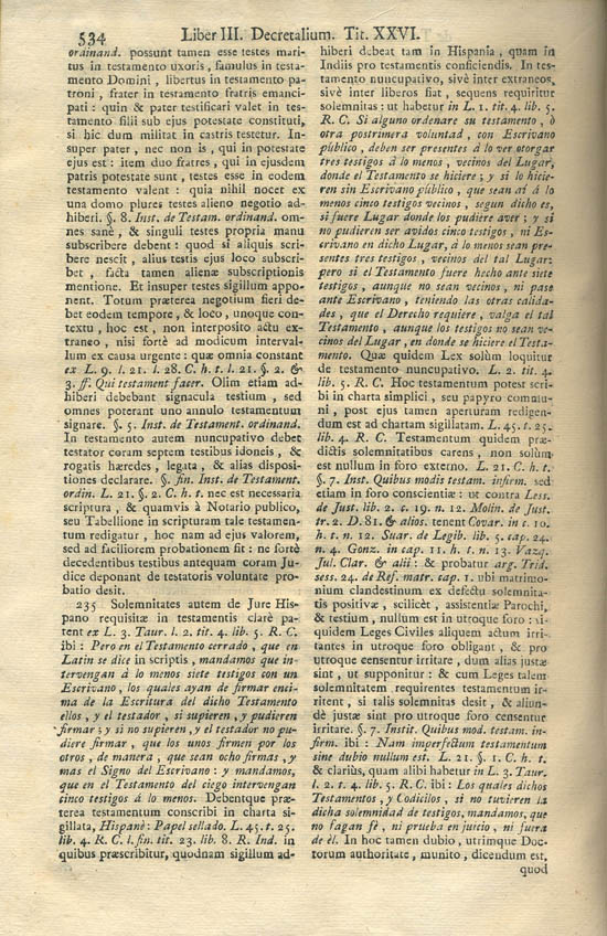 235. Las formalidades requeridas por el derecho español en los testamentos aparecen claramente in L. 3. Taur. l. 2. tit. 4. lib. 5. R. C. donde dice: Pero en el testamento cerrado, que en latín se dice in scriptis, mandamos que intervengan a lo menos siete testigos con un Escrivano, los cuales hayan de firmar encima de la Escritura del dicho Testamento ellos, y el testador, si supieren y pudieren firmar; y si no supieren, y el testador no pudiere firmar, que los unos firmen por los otros, de manera que sean ocho firmas, y más el Signo del Escribano, y mandamos, que en el testamento del ciego intervengan