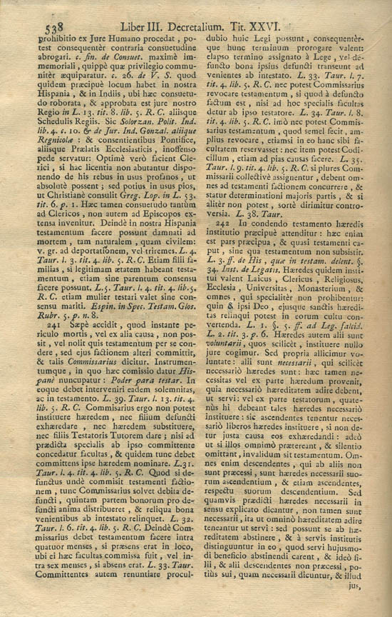 242. Al hacer un testamento se atiende principalmente a la institución del heredero, ya que esta es la parte principal y como la cabeza del testamento, y sin la cual el testamento no subsiste. L. 3. ff. de His quae in testam. delent. §. 34. Inst. de Legatis. Pueden ser nombrados herederos el laico, el clérigo, el religioso, la iglesia, la universidad, el monasterio, y todos los que no lo tienen especialmente prohibido. También al mismo Dios y a sus santos se les puede dejar la herencia para que se gaste en su culto. L. 1. §. 5. ad Leg. falcid. L. 2. tit. 3. p. 6. Los herederos, unos son voluntarios, es decir, para nombrar a los cuales no se está obligado por ningún derecho, sino que son nombrados por la propia voluntad; otros son necesarios, es decir, los que necesariamente son herederos. Sin embargo esta necesidad viene o de parte de los herederos, porque necesariamente deban recibir herencia, como los siervos; o de parte de los testadores, ya que éstos deben nombrar necesariamente tales herederos. Así los ascendientes deben nombrar herederos a sus hijos, si no se da una justa causa para desheredarlos, al grado que si se les excluye del todo, o se omiten en silencio, el testamento es inválido. Porque todos los descendientes, que no son precedidos por otros, son herederos necesarios de sus ascendientes. Pero aunque los predichos herederos se digan necesarios, en el sentido explicado, sin embargo, no son necesarios